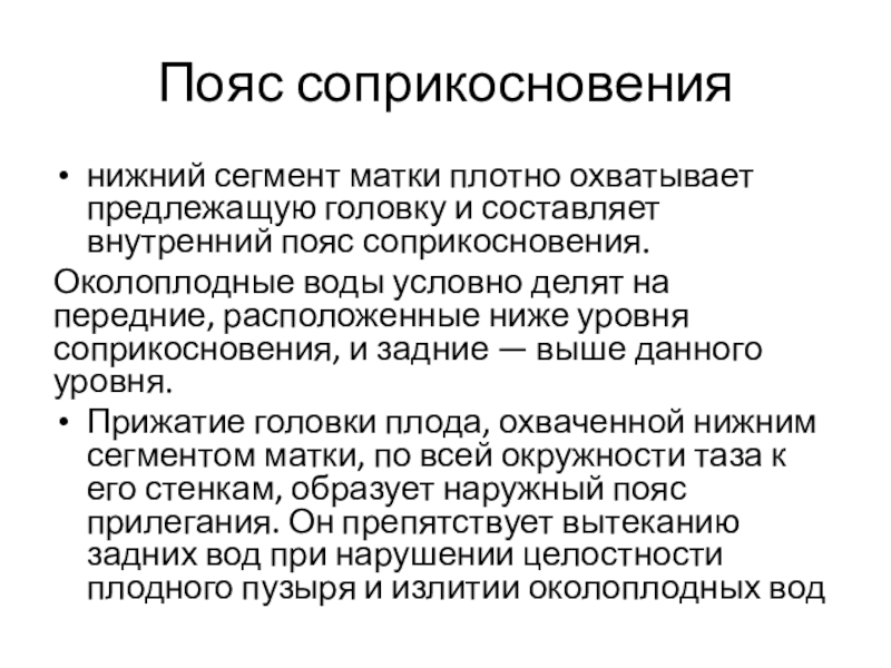 Прижатие головки плода, охваченной нижним сегментом матки, по всей окружности таза к его стенкам, образует наружный пояс прилегания. Он препятствует вытеканию задних вод при нарушении целостности плодного пузыря и излитии околоплодных вод