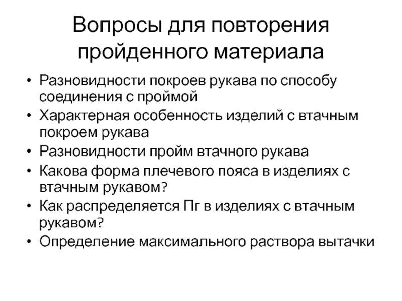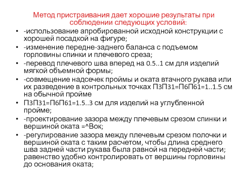 -регулирование зазора между плечевым срезом полочки и вершиной оката с таким расчетом, чтобы длина среднего шва задней части рукава была равной на передней части; равенство удобно контролировать от вершины горловины до основания оката;