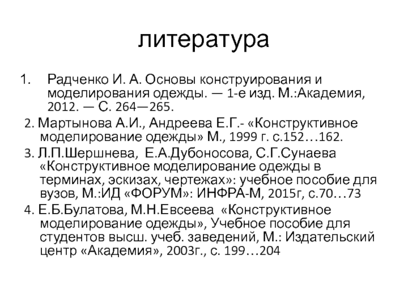 4. Е.Б.Булатова, М.Н.Евсеева «Конструктивное моделирование одежды», Учебное пособие для студентов высш. учеб. заведений, М.: Издательский центр «Академия», 2003г., с. 199…204