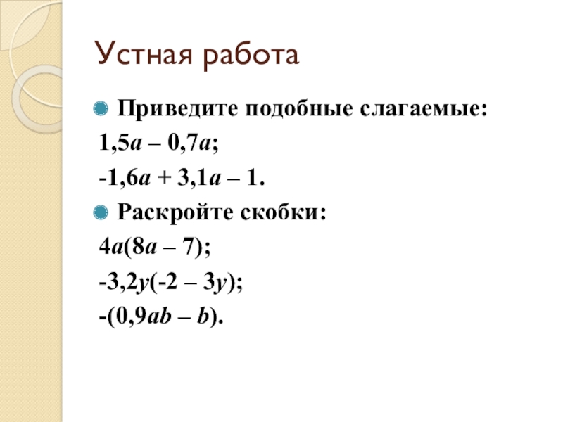 Устная работаПриведите подобные слагаемые:1,5a – 0,7a;-1,6a + 3,1a – 1.Раскройте скобки:4a(8a – 7);-3,2у(-2 – 3у);-(0,9ab – b).