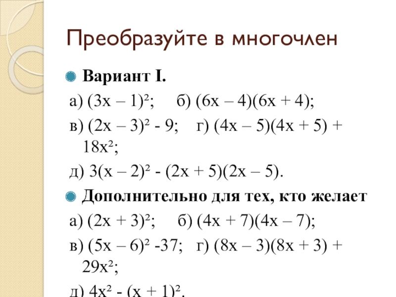 Преобразуйте в многочленВариант I.а) (3х – 1)²;   б) (6х – 4)(6х + 4);в) (2х –