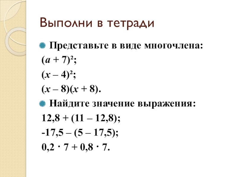 Выполни в тетрадиПредставьте в виде многочлена:(a + 7)²;(x – 4)²;(x – 8)(x + 8).Найдите значение выражения:12,8 +