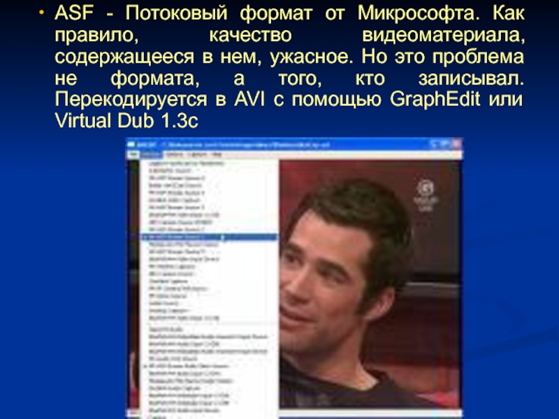 Слайд 9ASF - Потоковый формат от Микрософта. Как правило, качество видеоматериала,