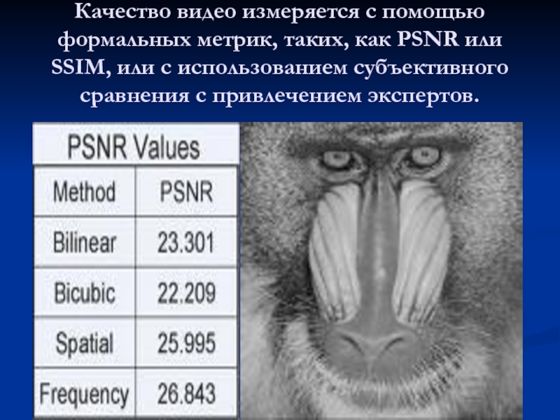 Слайд 5Качество видео измеряется с помощью формальных метрик, таких, как PSNR