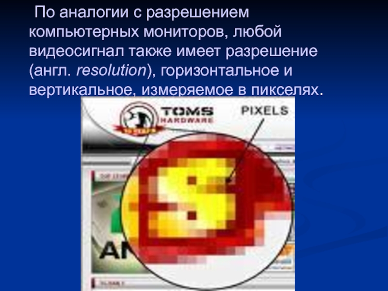 видеосигнал также имеет разрешение (англ. resolution), горизонтальное и вертикальное, измеряемое