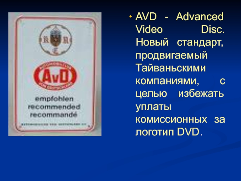 Слайд 14AVD - Advanced Video Disc. Новый стандарт, продвигаемый Тайваньскими компаниями,