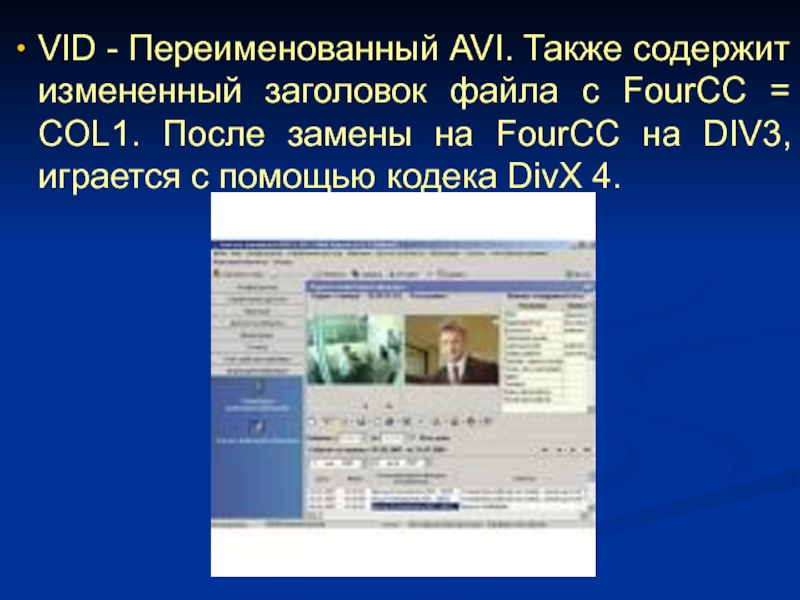 Слайд 12VID - Переименованный AVI. Также содержит измененный заголовок файла с