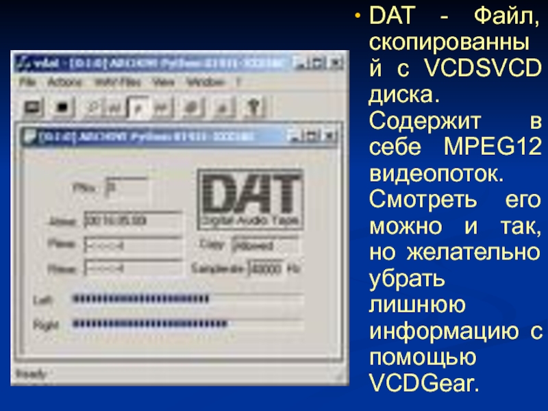 Слайд 10DAT - Файл, скопированный с VCDSVCD диска. Содержит в себе