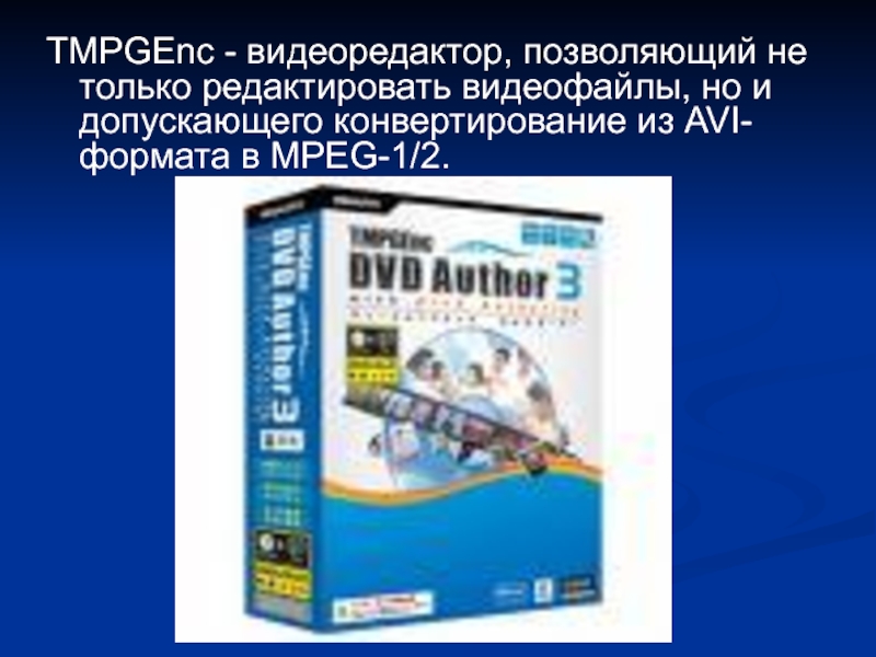 Слайд 20TMPGEnc - видеоредактор, позволяющий не только редактировать видеофайлы, но и