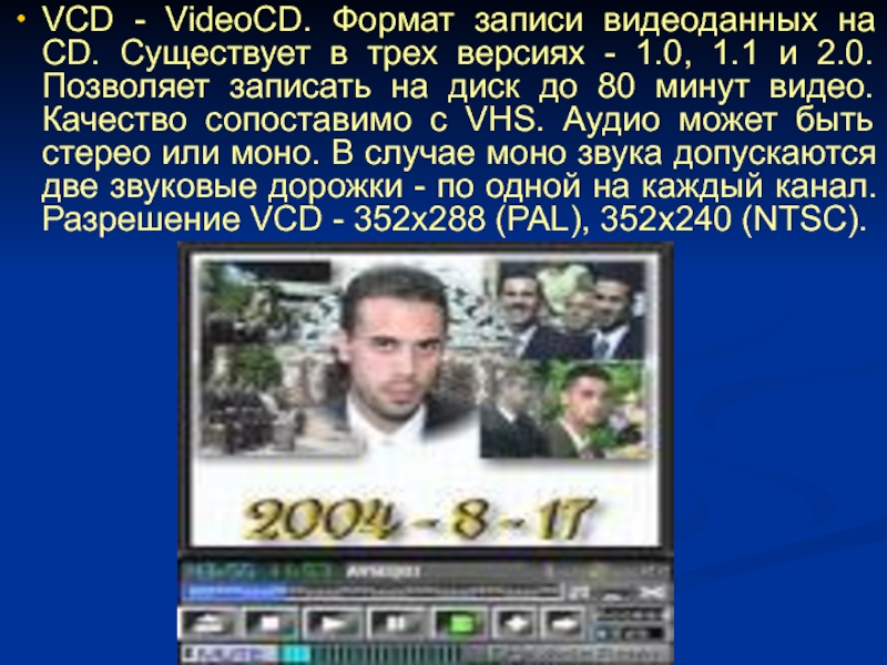 Слайд 8VCD - VideoCD. Формат записи видеоданных на CD. Существует в