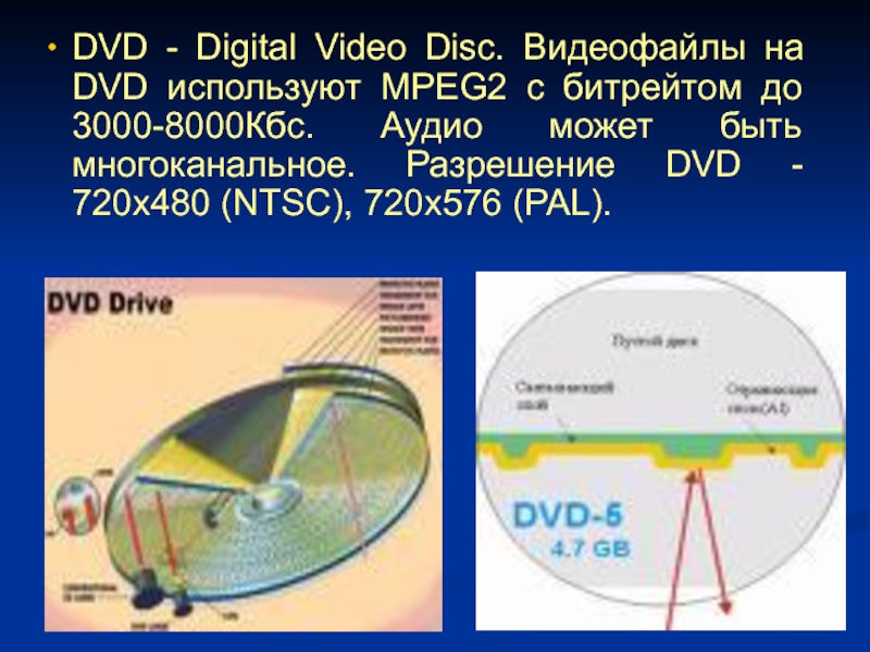 Слайд 13DVD - Digital Video Disc. Видеофайлы на DVD используют MPEG2
