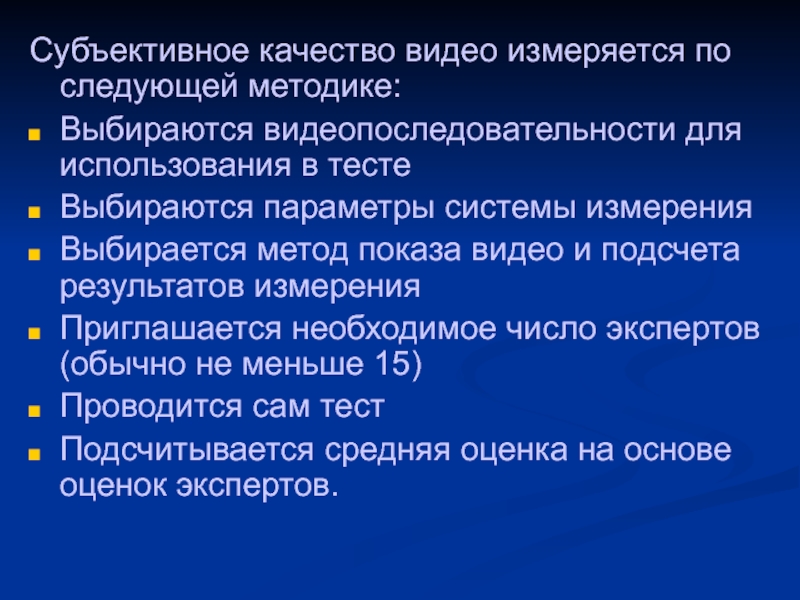 Слайд 6Субъективное качество видео измеряется по следующей методике: