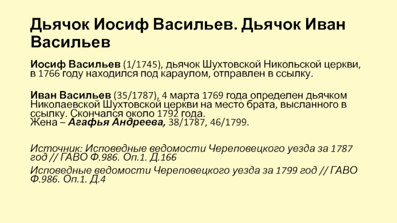 Иван Васильев (35/1787), 4 марта 1769 года определен дьячком Николаевской Шухтовской церкви на место брата, высланного в ссылку. Скончался около 1792 года.
