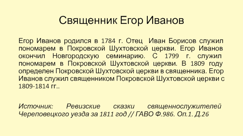 Новгородскую семинарию. С 1799 г. служил пономарем в Покровской Шухтовской церкви. В 1809 году определен Покровской Шухтовской церкви в священника. Егор Иванов служил священником Покровской Шухтовской церкви с 1809-1814 гг..