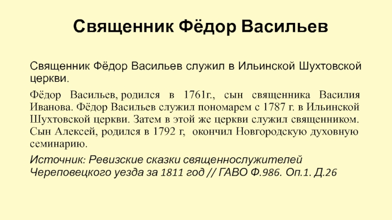 Священник Фёдор Васильев служил в Ильинской Шухтовской церкви.