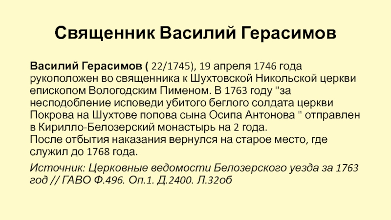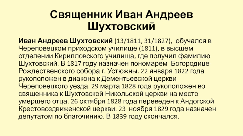 1787-1795 г. –служил священником Покровской Шухтовской церкви. Умер в 1795