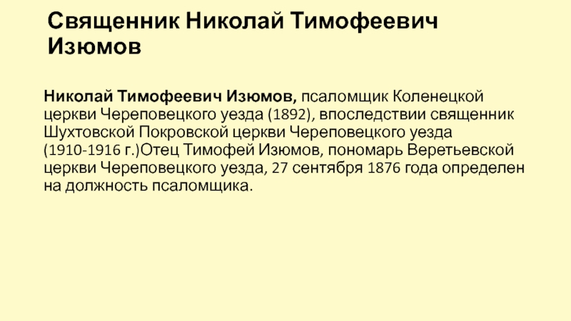 Николай Тимофеевич Изюмов, псаломщик Коленецкой церкви Череповецкого уезда