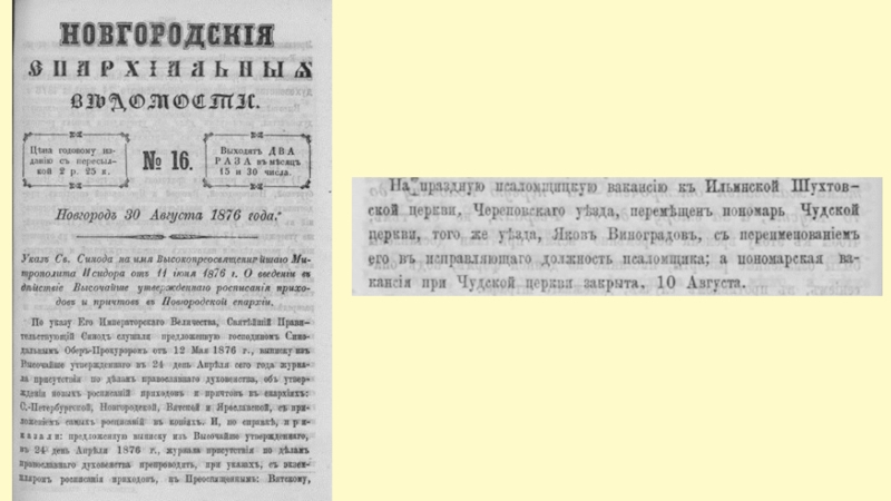 1876 – псаломщик Виноградов Яков, перемещен из Чудской церкви