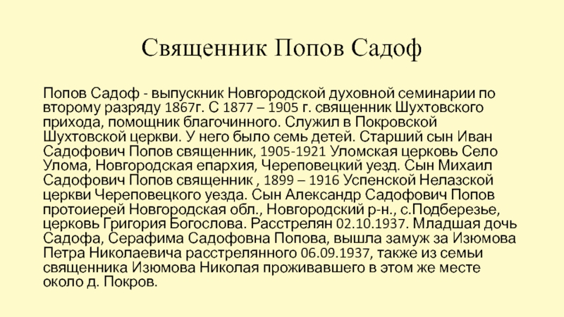 прихода, помощник благочинного. Служил в Покровской Шухтовской церкви. У него было семь детей. Старший сын Иван Садофович Попов священник, 1905-1921 Уломская церковь Село Улома, Новгородская епархия, Череповецкий уезд. Сын Михаил Садофович Попов священник , 1899 – 1916 Успенской Нелазской церкви Череповецкого уезда. Сын Александр Садофович Попов протоиерей Новгородская обл., Новгородский р-н., с.Подберезье, церковь Григория Богослова. Расстрелян 02.10.1937. Младшая дочь Садофа, Серафима Садофовна Попова, вышла замуж за Изюмова Петра Николаевича расстрелянного 06.09.1937, также из семьи священника Изюмова Николая проживавшего в этом же месте около д. Покров.