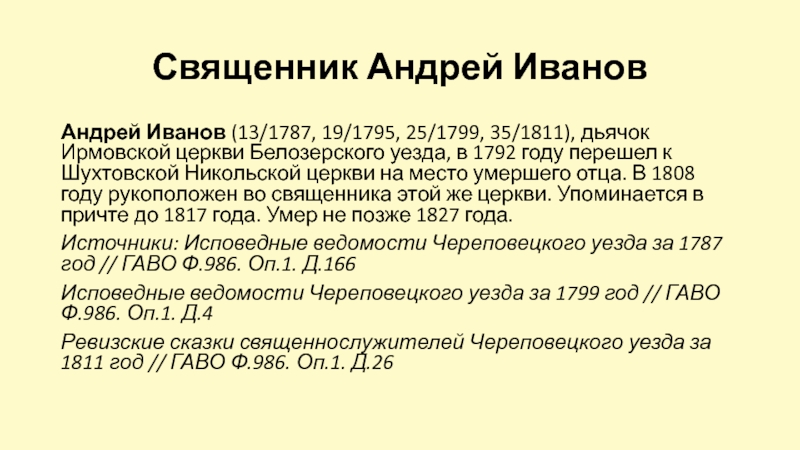 Источник: Ревизские сказки священнослужителей Череповецкого уезда за 1811 год // ГАВО Ф.986. Оп.1. Д.26