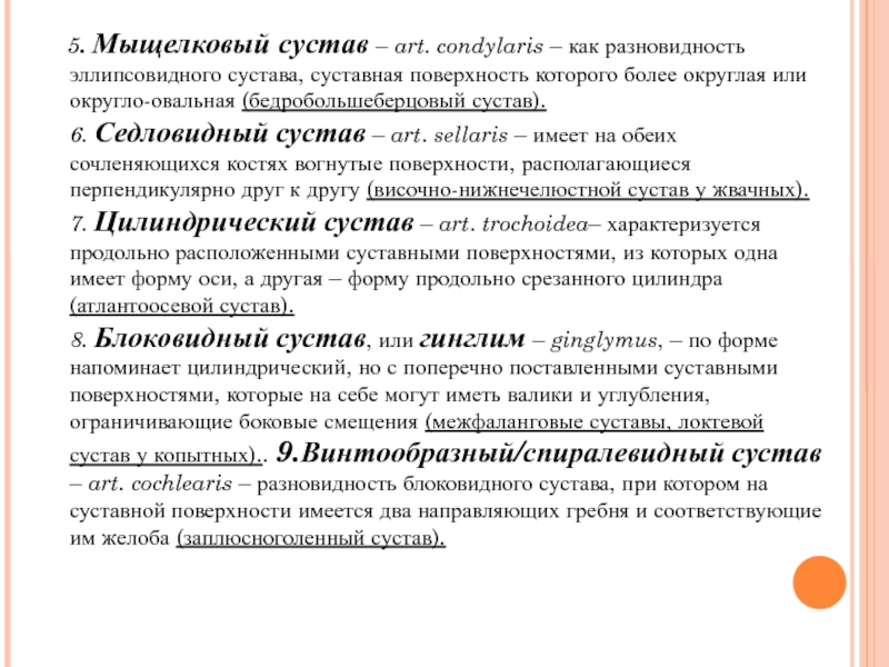 6. Седловидный сустав – art. sellaris – имеет на обеих сочленяющихся костях вогнутые поверхности, располагающиеся перпендикулярно друг к другу (височно-нижнечелюстной сустав у жвачных).
