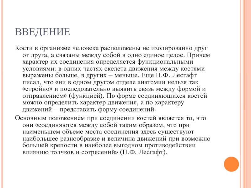 их соединения определяется функциональными условиями: в одних частях скелета движения между костями выражены больше, в других – меньше. Еще П.Ф. Лесгафт писал, что «ни в одном другом отделе анатомии нельзя так «стройно» и последовательно выявить связь между формой и отправлением» (функцией). По форме соединяющихся костей можно определить характер движения, а по характеру движений – представить форму соединений.