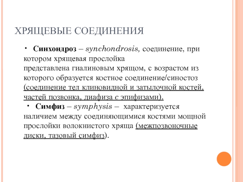 соединение/синостоз (соединение тел клиновидной и затылочной костей, частей позвонка, диафиза c эпифизами).