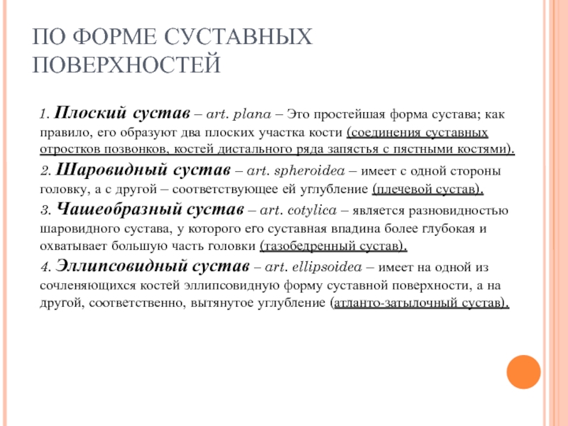 Слайд 16ПО ФОРМЕ СУСТАВНЫХ ПОВЕРХНОСТЕЙ