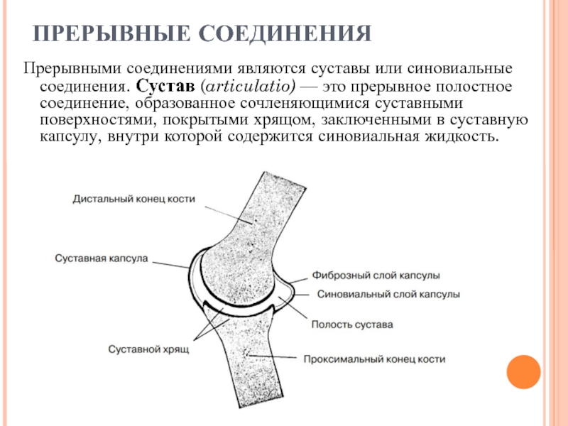Прерывными соединениями являются суставы или синовиальные соединения. Сустав (articulatio)