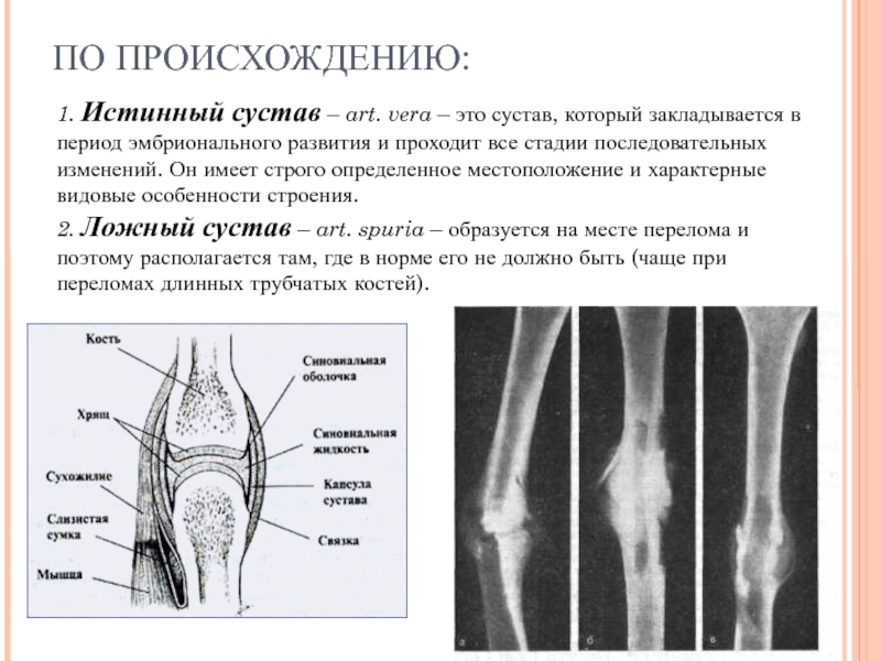 2. Ложный сустав – art. spuria – образуется на месте перелома и поэтому располагается там, где в норме его не должно быть (чаще при переломах длинных трубчатых костей).