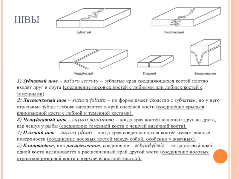 • Шов – sutura – выделяют из-за характерной формы краев соединяющихся костей, что наиболее выражено при соединении костей скелета головы.
