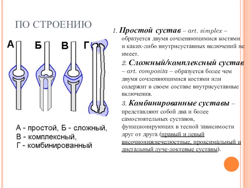 – art. composita – образуется более чем двумя сочленяющимися костями или содержит в своем составе внутрисуставные включения.