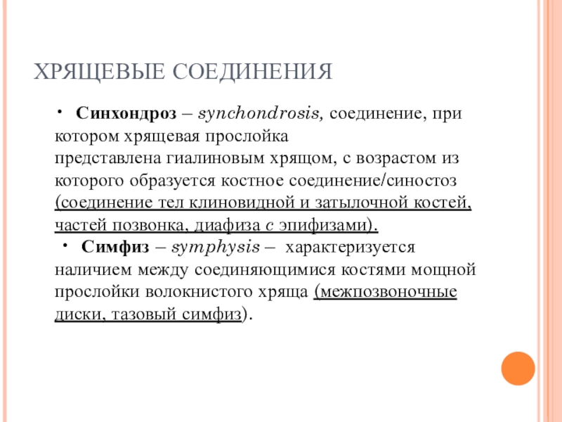 • Симфиз – symphysis – характеризуется наличием между соединяющимися костями мощной прослойки волокнистого хряща (межпозвоночные диски, тазовый симфиз).