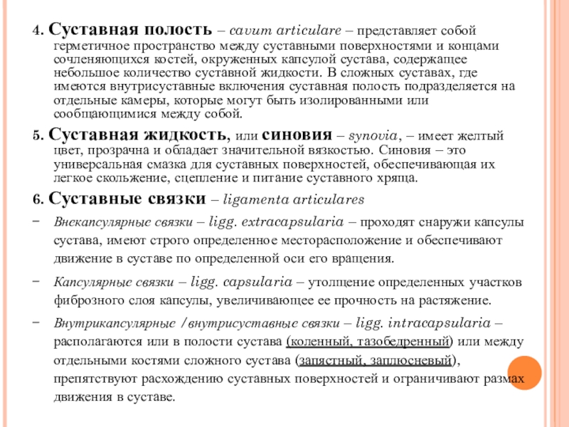 сустава, содержащее небольшое количество суставной жидкости. В сложных суставах, где имеются внутрисуставные включения суставная полость подразделяется на отдельные камеры, которые могут быть изолированными или сообщающимися между собой.