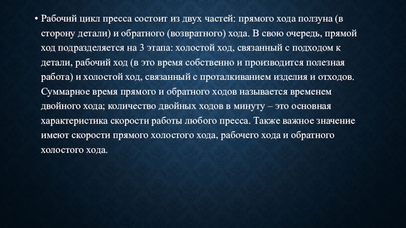 прямой ход подразделяется на 3 этапа: холостой ход, связанный с подходом к детали, рабочий ход (в это время собственно и производится полезная работа) и холостой ход, связанный с проталкиванием изделия и отходов. Суммарное время прямого и обратного ходов называется временем двойного хода; количество двойных ходов в минуту – это основная характеристика скорости работы любого пресса. Также важное значение имеют скорости прямого холостого хода, рабочего хода и обратного холостого хода.