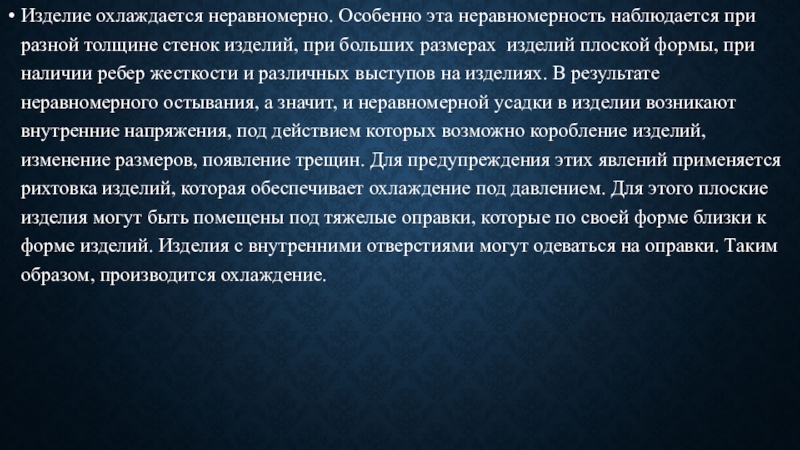 ребер жесткости и различных выступов на изделиях. В результате неравномерного остывания, а значит, и неравномерной усадки в изделии возникают внутренние напряжения, под действием которых возможно коробление изделий, изменение размеров, появление трещин. Для предупреждения этих явлений применяется рихтовка изделий, которая обеспечивает охлаждение под давлением. Для этого плоские изделия могут быть помещены под тяжелые оправки, которые по своей форме близки к форме изделий. Изделия с внутренними отверстиями могут одеваться на оправки. Таким образом, производится охлаждение.