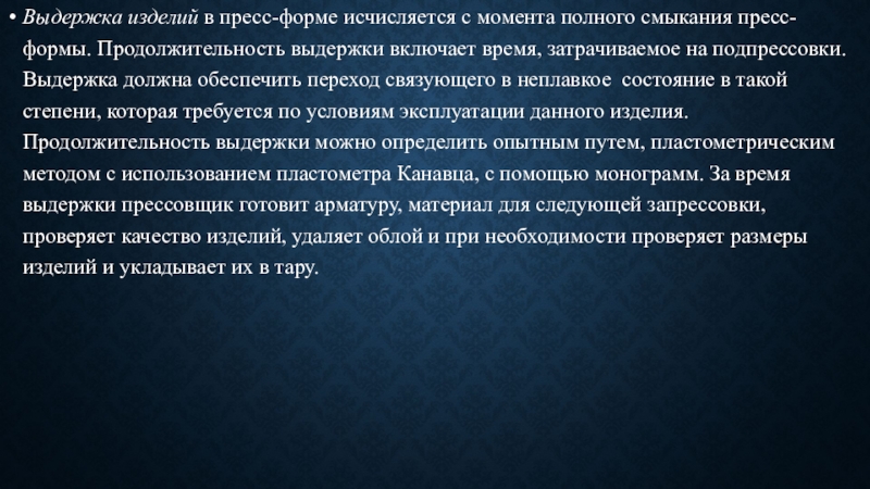 Слайд 7Выдержка изделий в пресс-форме исчисляется с момента полного смыкания пресс-формы. Продолжительность