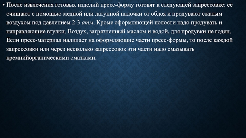 продувают сжатым воздухом под давлением 2-3 атм. Кроме оформляющей полости надо продувать и направляющие втулки. Воздух, загрязненный маслом и водой, для продувки не годен. Если пресс-материал налипает на оформляющие части пресс-формы, то после каждой запрессовки или через несколько запрессовок эти части надо смазывать кремнийорганическими смазками.
