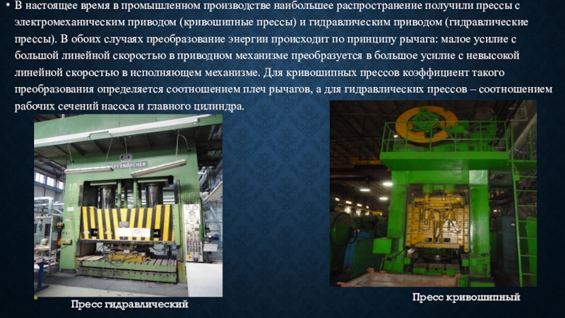 с электромеханическим приводом (кривошипные прессы) и гидравлическим приводом (гидравлические прессы).
