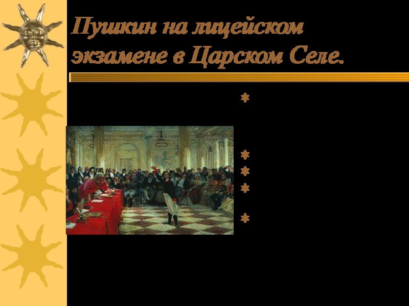 Слайд 12Пушкин на лицейском экзамене в Царском Селе.