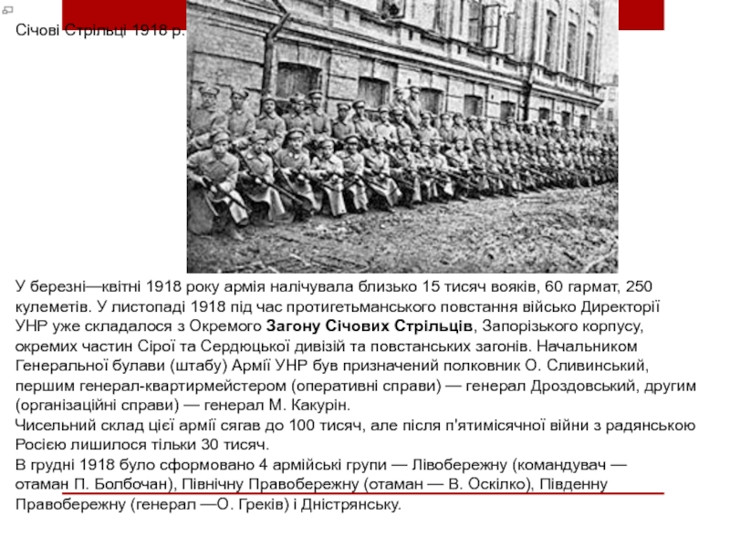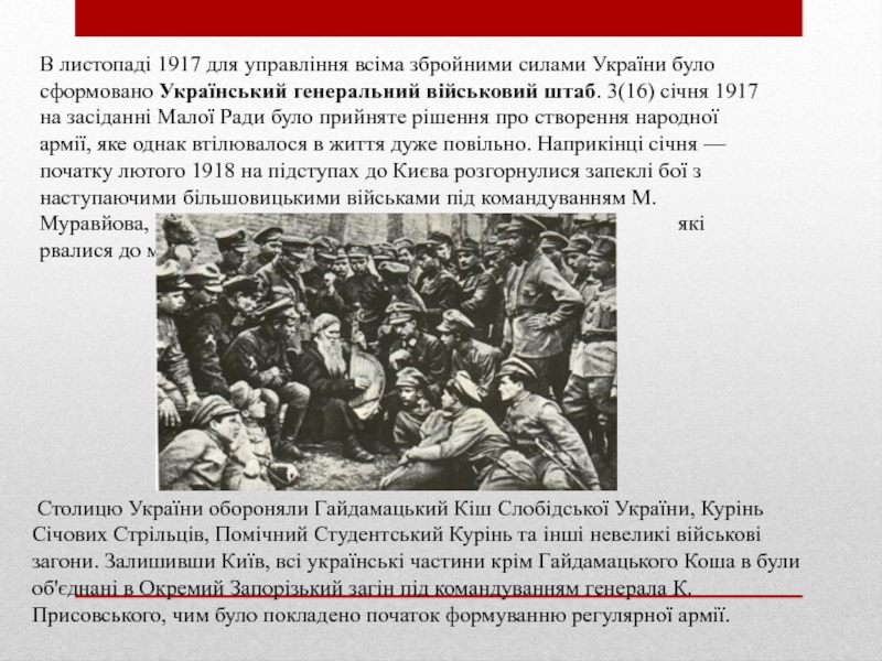 Столицю України обороняли Гайдамацький Кіш Слобідської України, Курінь Січових Стрільців, Помічний Студентський Курінь та інші невеликі військові загони. Залишивши Київ, всі українські частини крім Гайдамацького Коша в були об'єднані в Окремий Запорізький загін під командуванням генерала К. Присовського, чим було покладено початок формуванню регулярної армії.