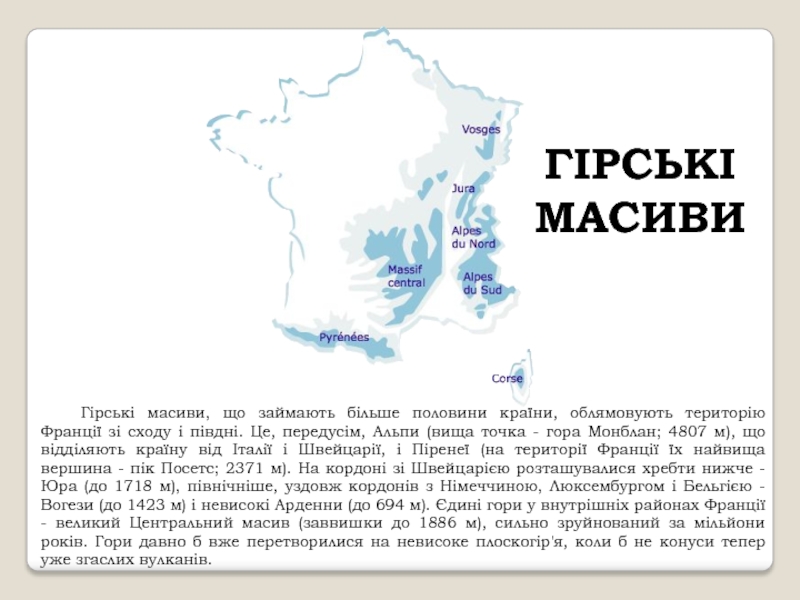 - гора Монблан; 4807 м), що відділяють країну від Італії і Швейцарії, і Піренеї (на території Франції їх найвища вершина - пік Посетс; 2371 м). На кордоні зі Швейцарією розташувалися хребти нижче - Юра (до 1718 м), північніше, уздовж кордонів з Німеччиною, Люксембургом і Бельгією - Вогези (до 1423 м) і невисокі Арденни (до 694 м). Єдині гори у внутрішніх районах Франції - великий Центральний масив (заввишки до 1886 м), сильно зруйнований за мільйони років. Гори давно б вже перетворилися на невисоке плоскогір'я, коли б не конуси тепер уже згаслих вулканів.