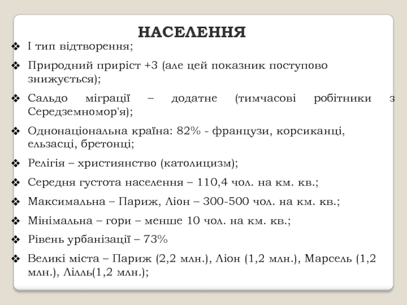 Великі міста – Париж (2,2 млн.), Ліон (1,2 млн.), Марсель (1,2 млн.), Лілль(1,2 млн.);