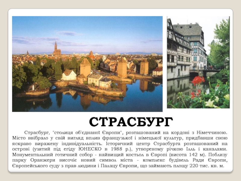 свою яскраво виражену індивідуальність. Історичний центр Страсбурга розташований на острові (узятий під егіду ЮНЕСКО в 1988 р.), утвореному річкою Ілль і каналами. Монументальний готичний собор - найвищий костьол в Європі (висота 142 м). Поблизу парку Оранжери височіє новий символ міста - комплекс будівель Ради Європи, Європейського суду з прав людини і Палацу Європи, що займають площу 220 тис. кв. м.