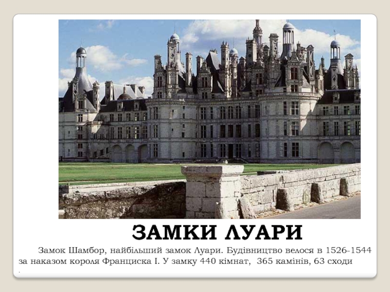 Замок Шамбор, найбільший замок Луари. Будівництво велося в 1526-1544