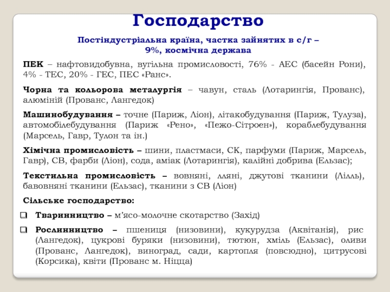 ПЕК – нафтовидобувна, вугільна промисловості, 76% - АЕС (басейн Рони),