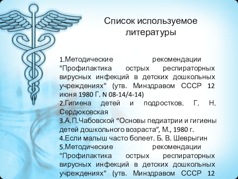 5.Методические рекомендации "Профилактика острых респираторных вирусных инфекций в детских дошкольных учреждениях" (утв. Минздравом СССР 12 июня 1980 Г. N 08-14/4-14)