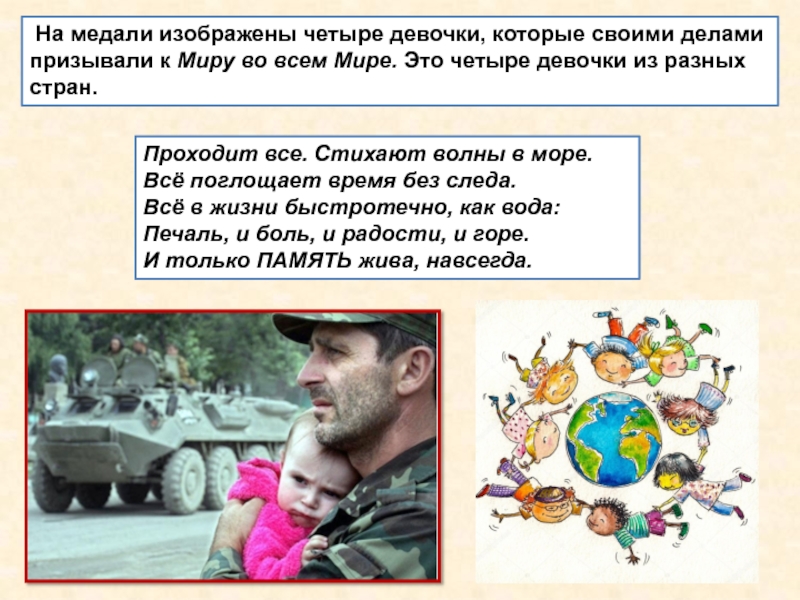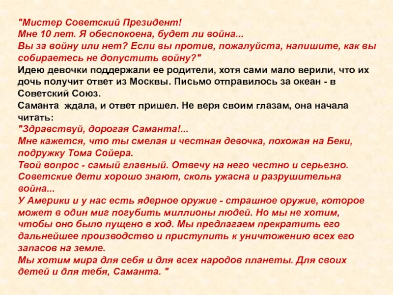 Мы хотим мира для себя и для всех народов планеты. Для своих детей и для тебя, Саманта. "