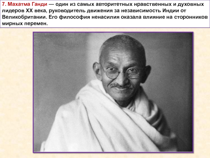 Слайд 567. Махатма Ганди — один из самых авторитетных нравственных и духовных