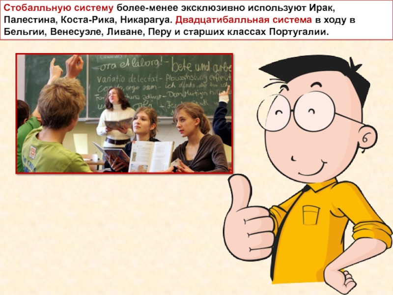 Слайд 27Стобалльную систему более-менее эксклюзивно используют Ирак, Палестина, Коста-Рика, Никарагуа. Двадцатибалльная